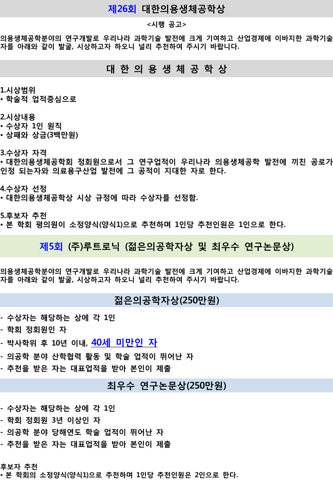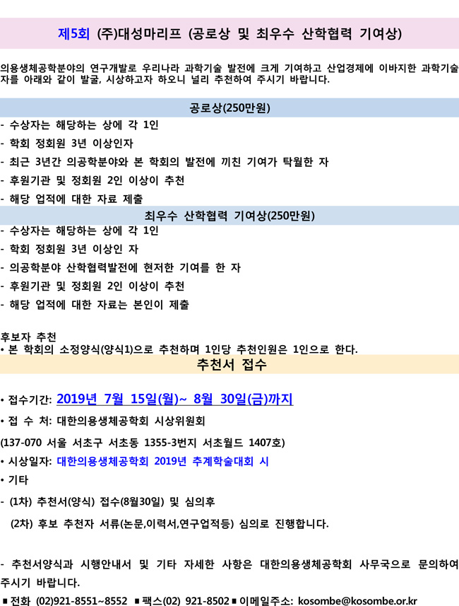 2019년 제26회 대한의용생체공학상 및 제5회 의공학상 안내
